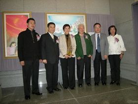 ![]() 台北县议员郑金隆(左二)、林建生图书馆馆长秘书陈安邦(右三)、县议员陈启能办公室主任陈世住(左一)、谷保家商校长郑学忠(右二)四位贵宾为「真善忍国际美展」揭画。主办单位新三才文化协会理事长张锦华教授(左三)以及专业导览人员谢春华老师 |