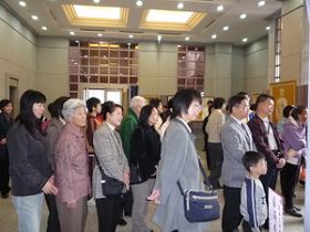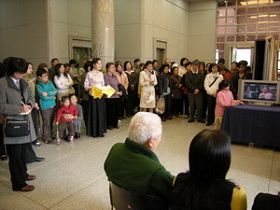 ![]() 芦洲市「真善忍国际美展」开幕典礼贵宾致词时,在场聆听的参观民众 |