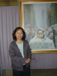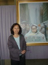 教美术十几年的李老师特别带两个年幼的小孩来参观美展,她表示《孤儿泪》图中的小女孩看起来很无辜,中共的迫害使得天真的小女孩成为孤儿,剥夺了小女孩原本幸福快乐的家庭,让她觉得很难过。李老师表示,我们可以给予正义的声援,加速中共体制的解体,让这些人不再继续被迫害。她原本以为只是来看视觉的美学欣赏,却意外获得心灵上的飨宴。她相信有神佛的存在,也认同宗教信仰的自由,她表示很高兴今天有此机会来了解法轮功。