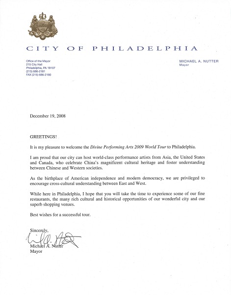 费城市长麦克尔•纳特(Michael A. Nutter)在他的贺信中说,很高兴欢迎神韵二零零九年全球巡演来到费城。