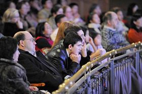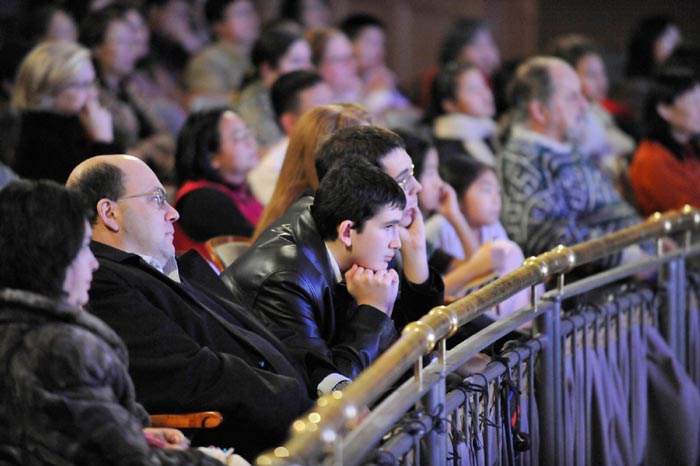 ![]() 二零零八年十二月二十日晚,观众凝神欣赏神韵纽约艺术团在费城的第三场演出 |