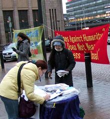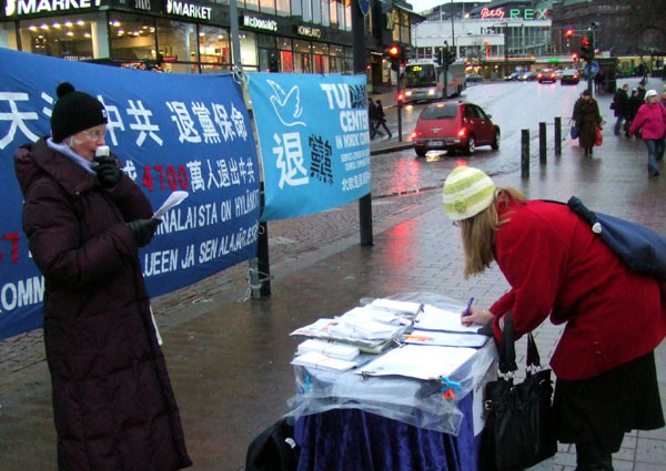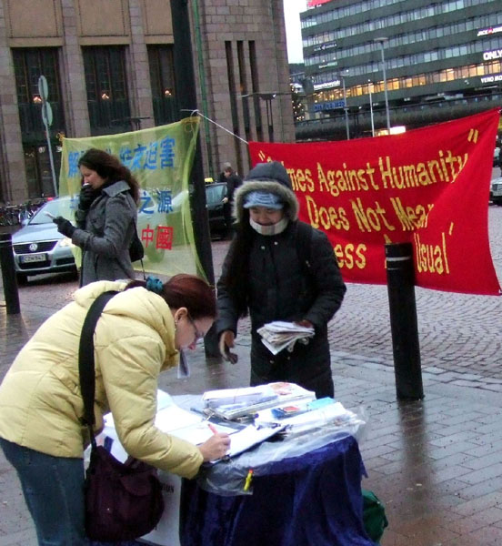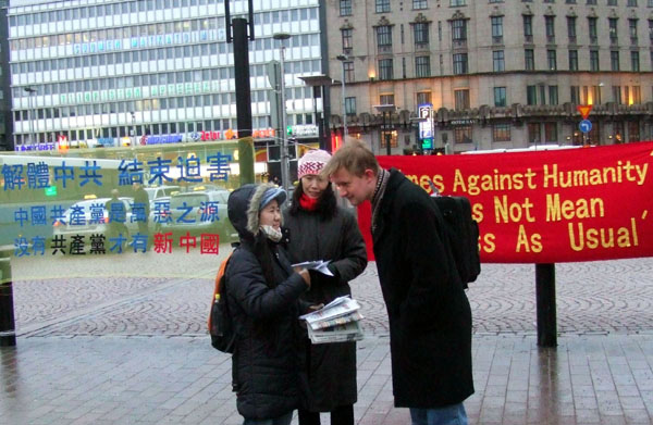 现场两位芬兰学员轮番用芬兰语向民众揭露中共自九九年始,在中国大陆对修炼真善忍的法轮功学员惨绝人寰的迫害真相;同时告诉人们,《大.纪.元;时报》发表《·九·评*共产党》四周年之际,已有四千七百万中国人通过各种不同渠道,在大.纪.元;网站发表声明退出中共组织(党、团、队),表示和中共恶党决裂。虽然当天寒风冬雨,很多芬兰民众仍驻足倾听,接纳传单,了解真相后立即签名声援法轮功。不少人赞扬法轮功学员做的好,把真相告诉人们很重要。