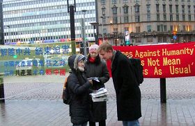 芬兰学员Sinikka说:“一位男士走过来,先看了征签表,看似有些不解,接着问怎么能帮助我们。我就告诉他,我们在告诉全世界的人中共的暴行,每一个善良的心灵都是反对这些暴行的,那么这就会形成一个大潮,这是由每一滴水滴组成的。他听了后走到桌旁签了名。并祝我们圣诞快乐。”