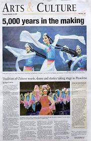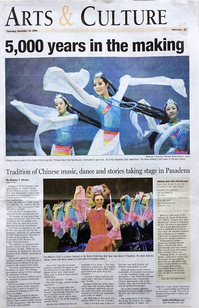 ![]() 帕萨迪纳星报《Pasadena Star》十二月十八日以将近整版的篇幅图文并茂的介绍了神韵晚会演出的特色、内容、时间和地点 |