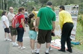 在另一方,学员也在公园中挂横幅和摆放真相展板,许多本地市民和游客纷纷停下脚步前来了解法轮功的真相。