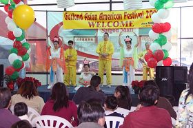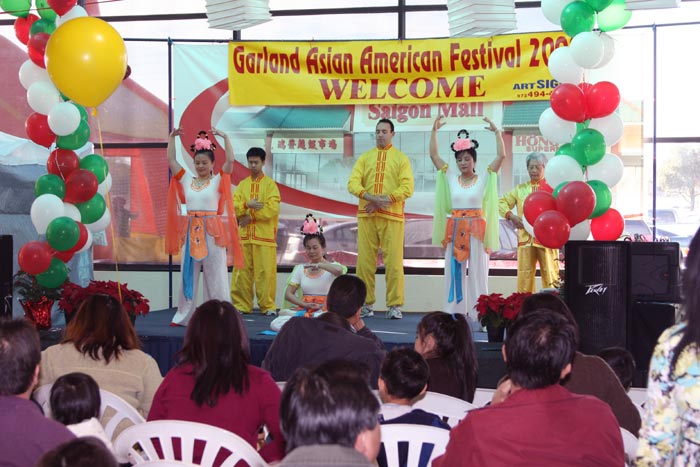 达拉斯法轮功学员今年再次参加该活动。首先是三名女学员为人们表演的莲花舞,受到热烈欢迎。接下来是六位法轮功学员在舞台上向人们演示功法。清晰的炼功音乐在大厅内响起,舞台上身着金黄色炼功服和舞蹈服装的学员立即成了视线的焦点,人们都在静静的观看,祥和、优美的五套功法使人们的思想都平静下来。演示结束时,观众们对学员报以热烈的掌声。