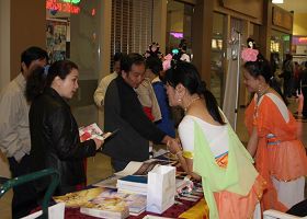 一位前几天在另一购物中心新!唐!人:展示台前知道神韵在达演出消息的越裔男士,看到这里也有神韵演出的信息,高兴的对学员说:“我上次知道后就去网上看了,已经为我和太太及朋友订好了五张票!我们非常期待!”