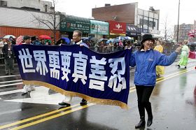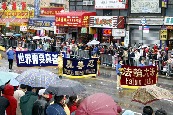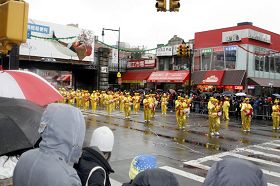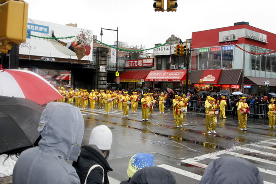 法轮功学员亮丽的服装、生龙活虎的龙狮队、祥和的炼功队伍,还有振奋人心的腰鼓队,已经成为法拉盛新年游行中一道亮丽的风景线。
