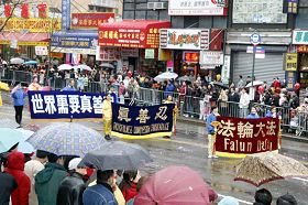 ![]() 冒雨观看游行的观众们被法轮功队伍吸引 |