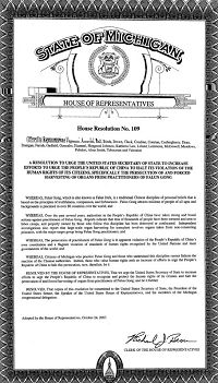 鉴于,密西根的法轮功学员和了解法轮功原则的公民无法理解中国政府的做法。所有尊重人权的公民要求增加对中华人民共和国的压力,要求其停止迫害法轮功。