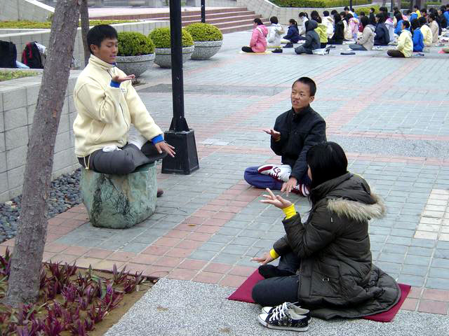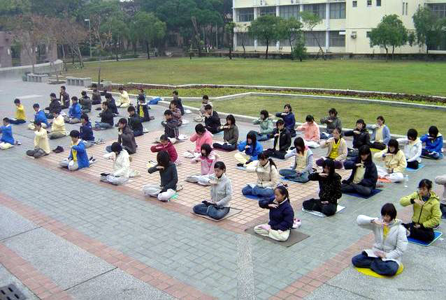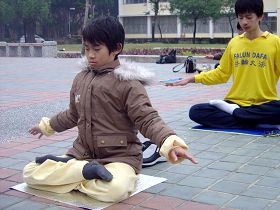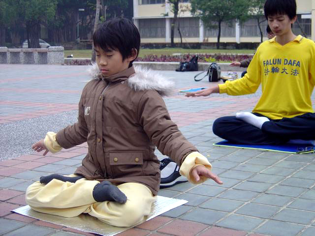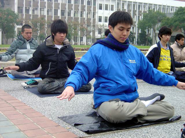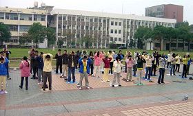 三天的活动安排的十分紧凑,身着印有“法轮大法”字样冬季衣服的青年学子们不畏寒流,清晨在成大的总图书馆前,排开队形炼五套功法,十分醒目,祥和的音乐让人在寒风中感受到平静与温暖;现场也有老学员示范并教新学员炼功,炼功之后则是密集的学法和交流。