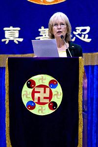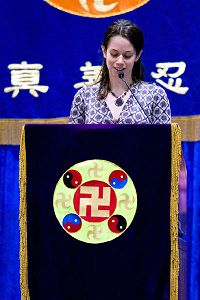 来自圣地亚哥的西方学员吉瑟拉•素默(Gilsela Sommer)在发言中她提到,从参加声援退!党!集会发言,到市议会上发言的过程中,她意识到这种害怕是对自我的一种强烈执着,其中包含怕犯错误,丢面子,担心会被别人嘲笑或责备;从而会害怕走出去面对面讲真相。她分享了在向政府部门讲真相过程中如何慢慢克服怕心的历程。
