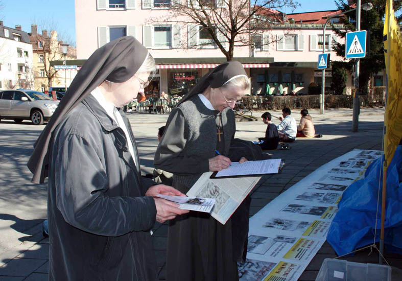 当两位修女散步路过中领馆时,她们被领馆对面炼功的法轮功学员吸引,并仔细观看了有关中共活体摘取法轮功学员器官的横幅和材料,她们询问为什么法轮功会在中国遭迫害,法轮功学员告诉她们,因为他们修“真善忍”,这跟中共的本质格格不入,因为中共害怕“真善忍”。