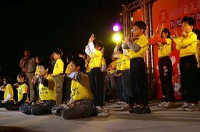 台上主持人夸奖小弟子的好表现,并告诉观众们法轮功很好,欢迎大家来学,社区旁公园、学校就有炼功点,完全免费,请大家相互告诉。