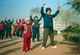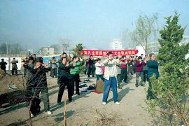 【明慧网二零零八年二月二十七日】一九九五年,山东蒙阴大法弟子在汶溪公园炼功洪法图片。