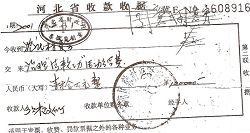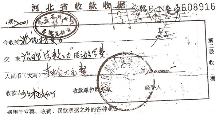 二零零一年到北京上访,朱兰英向政府说明自己学法轮功后受益的情况,被恶警绑架并遭到严重殴打,后被劫持回保定,在韩村乡派出所遭恶警殴打(当时韩村乡派出所所长是黄新宅,副所长是杨春涛),并被韩村乡非法罚款十万元(当时韩村乡乡长是马跃彬),并开出收据(后附收据一张)。因家人拿不出钱,于是每年从村里给村民发的各种款项中扣除,一直扣到现在。