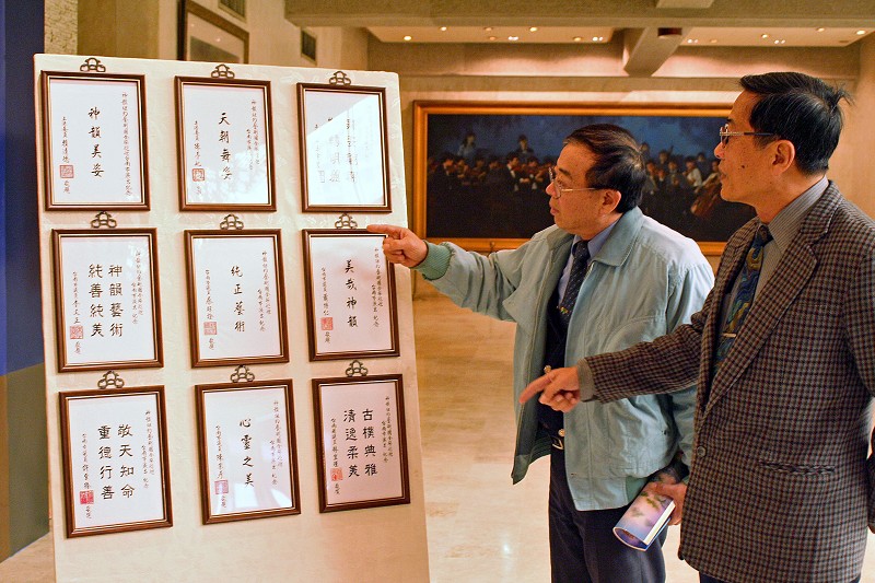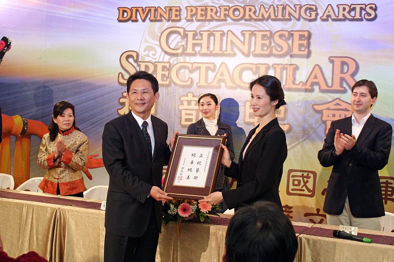![]() 台南市政府秘书长谢世杰代表市长许添财致赠匾额「正统艺术 纯善纯美」予神韵纽约艺术团 |