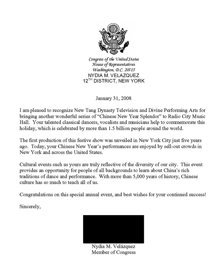 我很高兴能给予新!唐!人:电视台和神韵艺术团褒奖,赞赏你们莅临无线电音乐城、再次为我们带来一台精彩的“华人新年晚会”。你们才华横溢的舞蹈演员、歌唱家和音乐家在全球十五亿人同庆佳节之际为我们献上节日庆典。