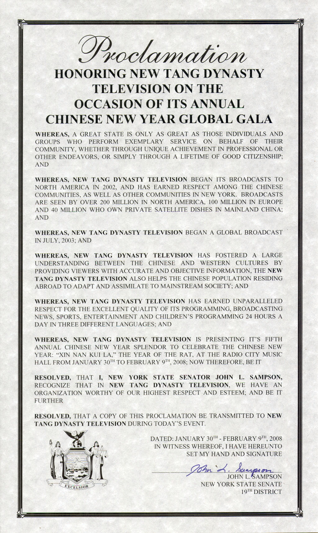 鉴此,现决定,我,纽约州参议员,约翰•萨姆森(John Sampson),嘉奖新!唐!人:电视台,新!唐!人:电视台值得我们给予最高的敬意和尊敬。