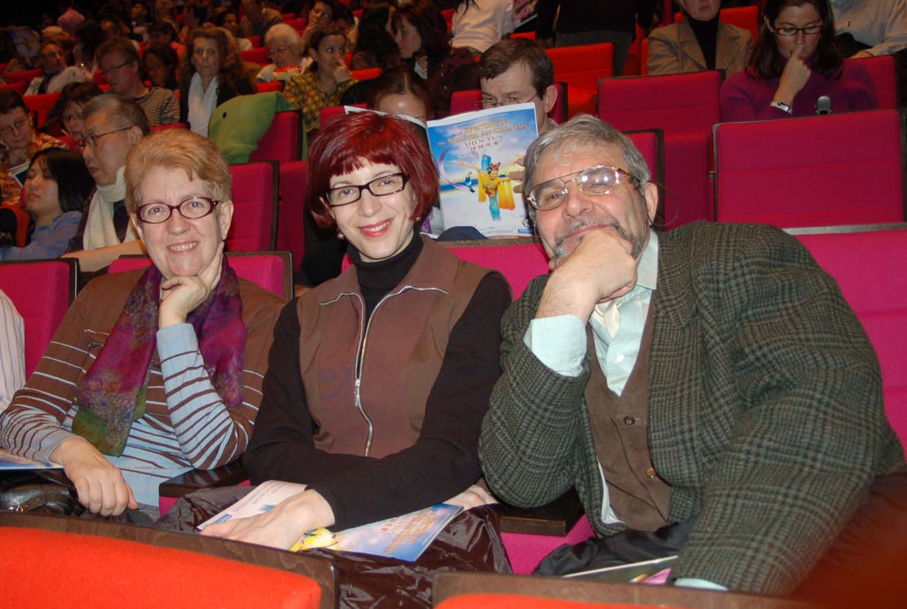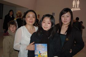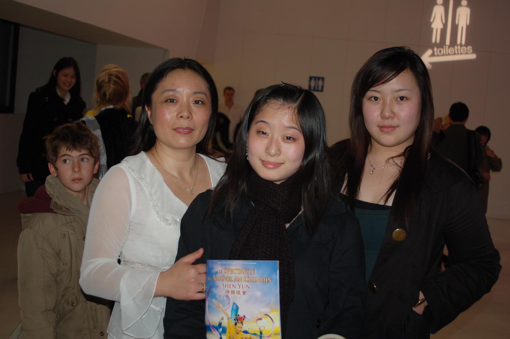 ![]() 王女士(左)和她的刚从中国山东来法国读书的姑娘(右一)及外甥女(中)一起观看神韵晚会。 |