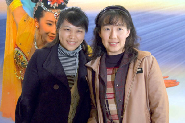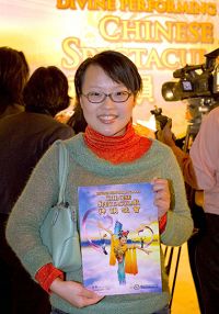 在中场休息时,二位小姐相互在迎宾大厅里神韵纽约艺术团领舞演员任凤舞的照片前拍照留念。她们二人非常兴奋的接受采访,并表示,在学校及大卖场看到神韵的广告就被吸引了,于是二人相邀一同来观赏。她们表示,这是第一次看到这样大型且结合舞蹈、歌唱及二胡演奏的演出。