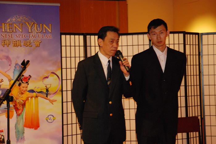 ![]() 著名男高音歌唱家关贵敏代表神韵巡回艺术团在贵宾酒会上发言。 |