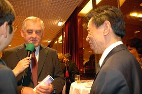 当天晚上,来自捷克各界的政要名流出席了演出前的贵宾招待会,捷克参议院副主席Lika先生亲临酒会,并与神韵巡回艺术团副团长关贵敏先生会面交谈。