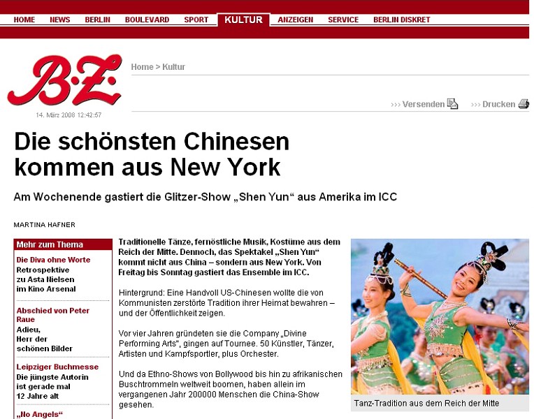 ![]() 三月十三日,《柏林报(Berliner Zeitung)》用“最美的中国人从纽约来”为题,宣告了神韵的到来。 |