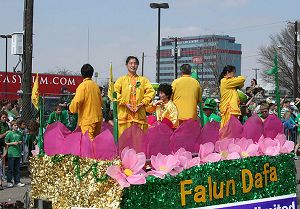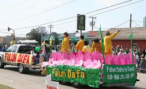 法轮功学员精心设计、装饰了与游行主题呼应的花车,“FALUN DAFA”、“法轮大法好”和大法网址的字样清晰醒目。五名身着金黄色炼功服的学员在花车上演示优美、祥和的五套功法。许多观众对他们报以热烈的掌声,还有人跟着学炼功的动作。