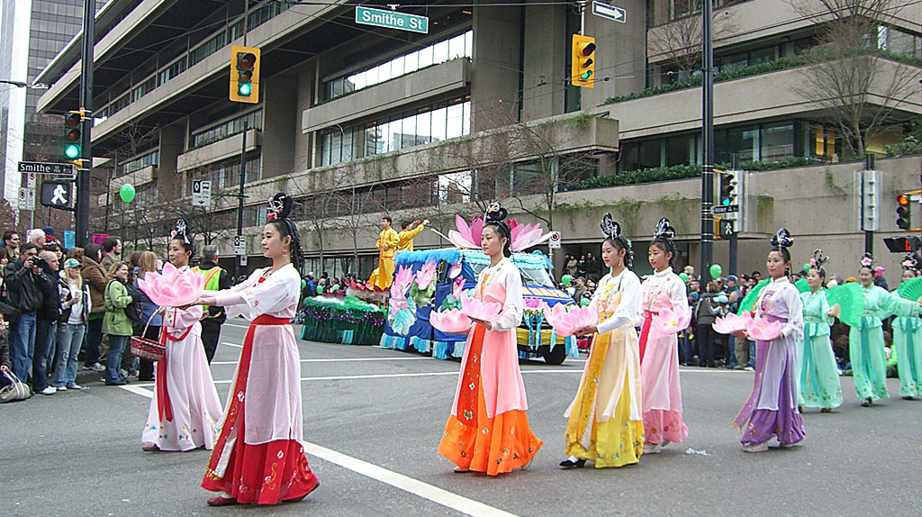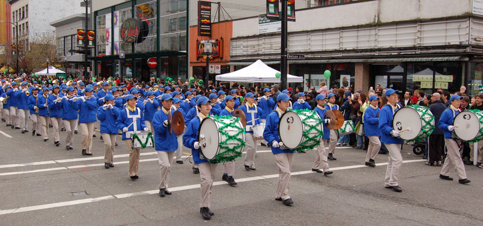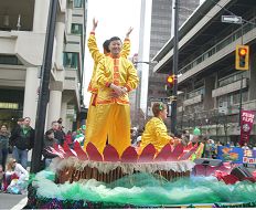 天国乐团在游行队伍中一出现,路边的观众就随着鼓声、军乐声鼓掌,踩着节拍舞动,“法轮大法好”、“法正乾坤”、“送宝”、“法鼓法号”一遍又一遍的送入观众的心扉,引起共鸣,一些观众听到法轮功学员创作的音乐情不自禁的流下眼泪。“永远的枫叶”乐声刚落定,就听到一些西人观众在大声说:Thank you (谢谢你们)!