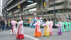 两位来自韩国的女士说,她们觉的法轮功的队伍非常漂亮,极富东方韵味,队伍非常壮观。