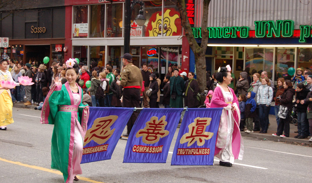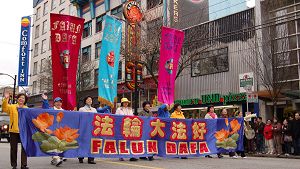 当日的游行中,法轮功队伍延绵最长,打出的横幅不多,但非常大而且醒目,“法轮大法好”、“真、善、忍”的强烈信息以及法轮功学员善良、平和的笑容感染了观众。