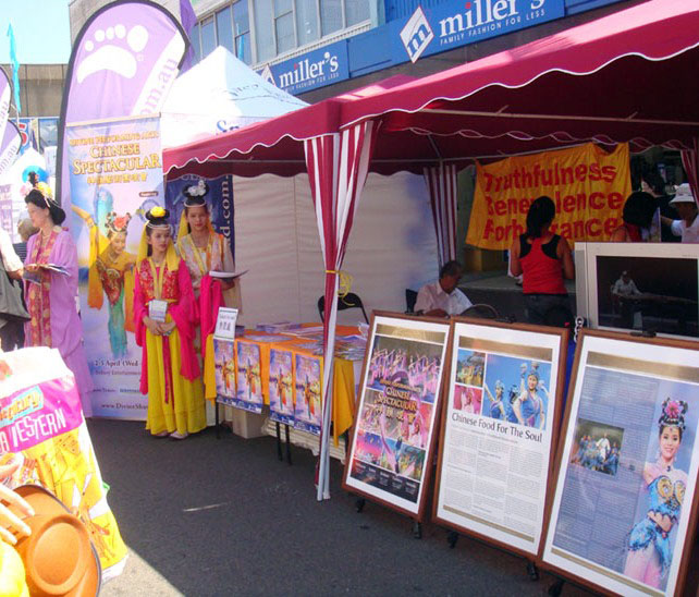 在艺术节活动主街上,法轮功学员一早就搭好了介绍神韵晚会的服务咨询台。