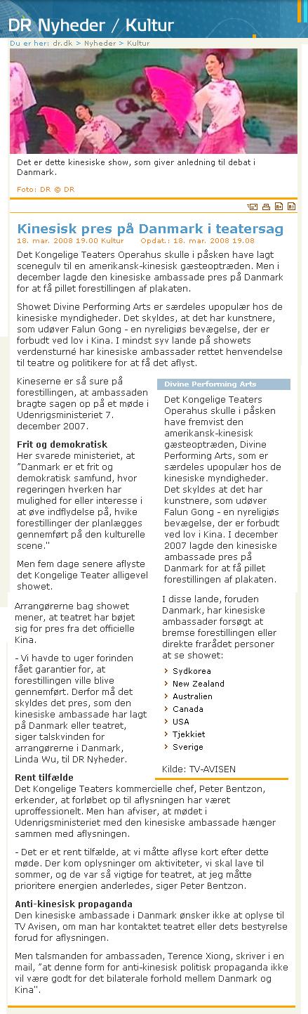 丹麦皇家歌剧院原本要在复活节期间上演一台来自美国的中国传统文化演出“神韵艺术晚会”。但是在去年十二月份,由于中共政府驻丹麦大使馆施压,迫使皇家歌剧院单方面取消了这次演出。