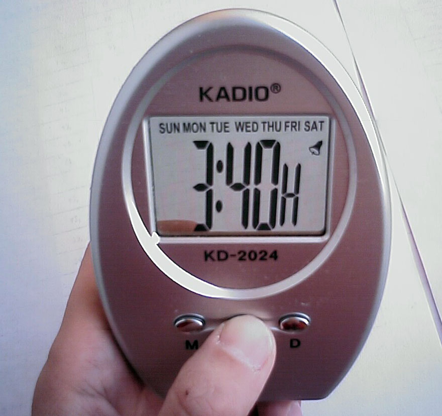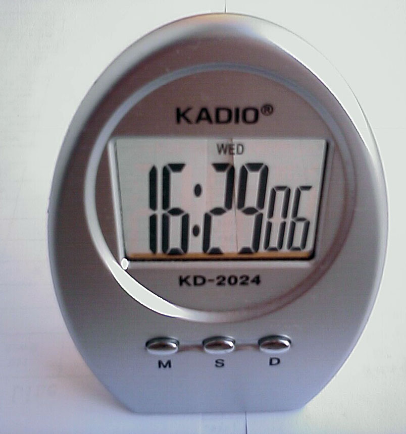 长期以来,我们地区一直采用透明的具有液晶显示功能的小型数字电子钟,效果很好。这种钟说白了就是一块稍大一点的电子表,种类很多,销售范围非常广,在大陆任何一家卖表的店都有多款此类产品,如图1。这类小表都具有一个独特的整点鸣叫功能,一旦启动,每到整点都会发出非常清脆的鸣叫声。这类小表一般具有三个按钮,启动方法是按住中间的不放,再配合按一下第一个或第三个键(不同牌号有差异),会在透明的液晶显示屏幕顶端出现英文的星期字母,这时就启动了整点报时功能,再按一下则消失,如图2所示。启动该功能后,每天24个小时,均会在整点时发声提醒,尤其适合高密度整点发正念使用。但这一功能在说明书中没有说明,店员一般也不知道。