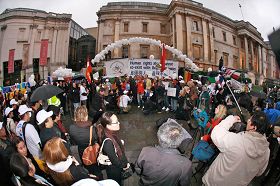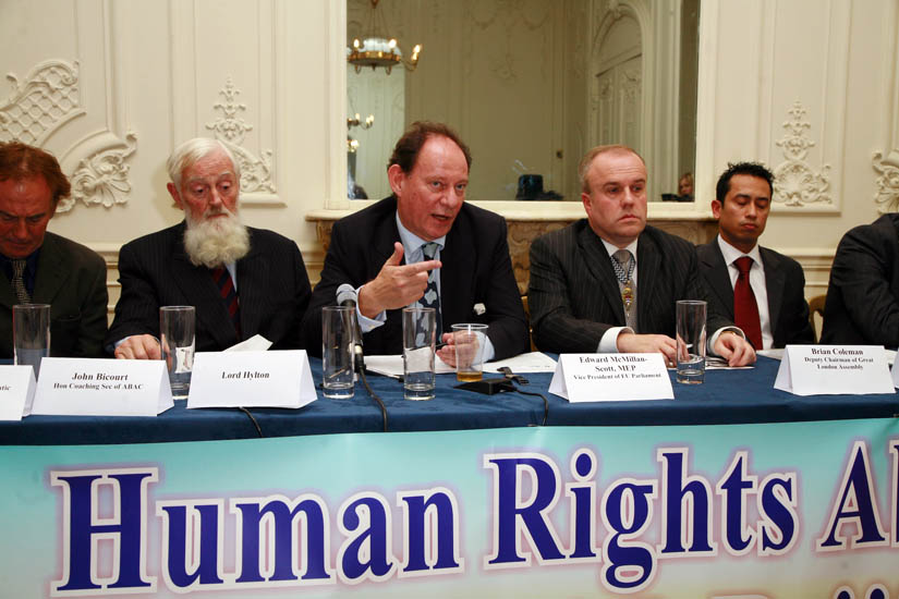 零七年十月二十五日下午,全球「人权圣火」接力抵达伦敦。欧洲议会副主席麦克米兰-斯考特先生在伦敦外国媒体协会主持新闻发布会,并和其他政要一起于下午四点参加了在伦敦特拉法加广场的圣火传递仪式。多名政要及人权组织代表发言,吸引了多家媒体和很多观众。