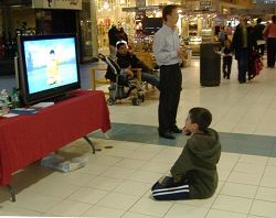 来购物的人们不时的停下来看法轮功的教功录像,索要学员分发的法轮功简介,并对功法表示了极大的兴趣。很多人都想学炼法轮功,并详细的询问了功法的特点和位于长岛的教功地点。很多人在现场就跟着教功录像比划起来。