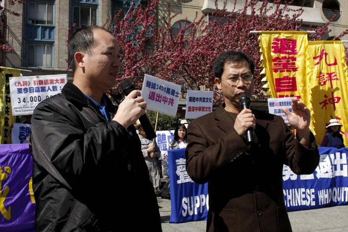 ![]() 集会发言人、北加州退!党!中心旧金山代表曾文彪和湾区电脑工程师张新宇。 |