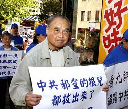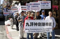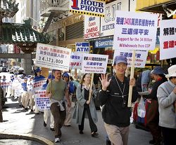 集会后,与会者们举行了游行;游行队伍穿过中国城的主要街道,吸引了不少路人的瞩目;他们有的争相拍照,有的询问详情,并有的在拿到揭露中共迫害人权的真相资料后,迫不及待马上阅读;还有华人上前对着队伍说:“你们做的很好;是越做越好。”