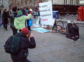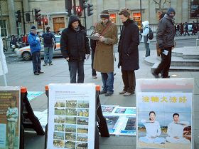 和往常的讲真相活动一样,学员们打出横幅、摆出法轮功真相展板,有的在宁静祥和的炼功音乐中展示法轮功五套功法,有的向过往的行人发放法轮功真相资料和传单并征签。摆放在路边的大量展板和“强烈抗议中共在奥运前大规模抓捕法轮功学员”的英文横幅吸引了很多人驻足观看,接传单的人也很多。人们纷纷在征签表上签名,谴责中共的暴行,声援制止迫害。