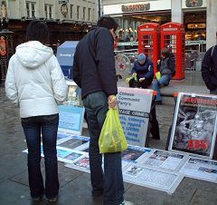 ![]() 两位中国留学生在认真仔细的阅读法轮功真相展板 |