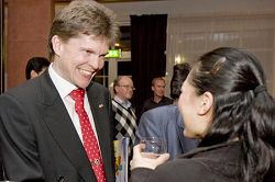 ![]() 东约特兰省国会议员Andreas Norlen(左)与神韵演员在交谈 |