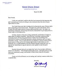 在中国,新闻自由被压制,宗教信仰自由被攻击。如同你们所有人,我对法轮功修炼人在中国的遭遇的相关报导深表关注,他们在中国信仰及言论自由受到限制,被强制关押乃至在关押中被酷刑折磨及杀害。我们作为一个国家,有责任对中国(中共)近日来在西藏的行径及其在其它国家所参与的严重违反人权的行径发声。尤其是现在,时值中国为今年夏季奥运会做准备之际,是美国呼吁世界所有国家共同面对这一巨大挑战的时候了。