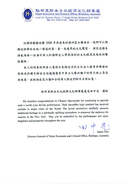 继澳洲六十多位政要纷纷祝愿神韵晚会圆满成功,台湾驻澳大利亚代表林松焕博士及布里斯本办事处田中光处长也向主办方发来贺信,赞赏神韵艺术团高水准之演出,不仅是视觉及心灵上的享受,也能得到内在心灵最佳之洗涤与省思。同时祝愿该团在澳演出圆满成功。