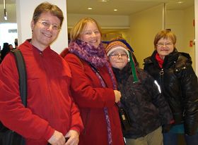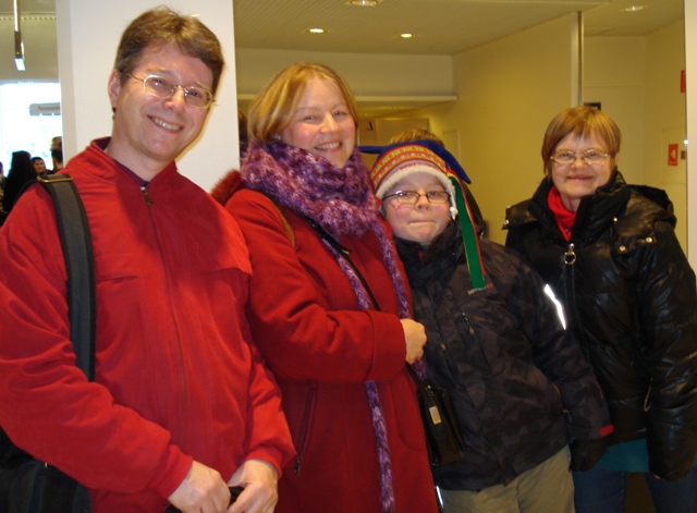 ![]() 波提.尧克南(Pertti Jokinen)一家人和姐姐萨拉来看演出;从左至右:波提、提娜、阿尔伯、萨拉。 |