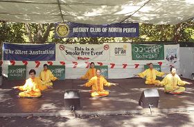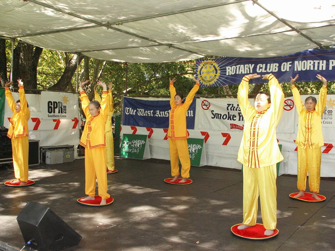 三日上午十一点半,法轮功学员在主持人简单介绍了法轮大法之后,为现场观众在舞台上演示了五套功法。主持人还提醒大家要前往法轮功学员的摊位签名呼吁制止在中国发生的迫害。