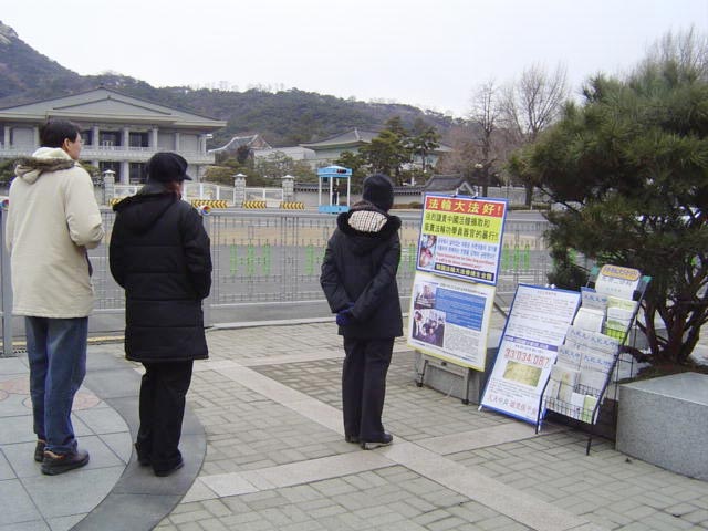 【明慧网二零零八年三月五日】(明慧记者陈正洪首尔报道)大韩民国的青瓦台(即总统府)是韩国中央政府最高的行政机构,也是各国游客在首尔市旅游必定造访之地。当地法轮功学员在青瓦台附近架设了真相展板,摆放揭露“中共活摘法轮功学员器官”、《