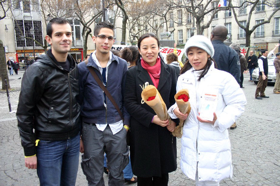 有两位法国小伙子,事后知道他们一个叫纳赛赫(Nacer),一个叫阿赫诺(Arnaud)。他们深深的为法轮功的故事所打动,在听讲时他们俩要求临时出去十分钟。过一会儿,两人带了两朵大大的红玫瑰,无声的献给两位法轮功学员。