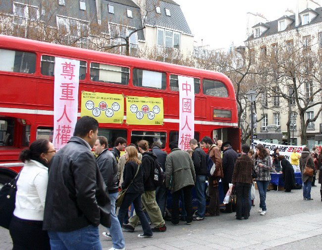 三天的活动期间,大赦国际租了一辆双层大轿车,邀请路人进去听取两位现居法国的法轮功学员讲述她们被中共非法关押、迫害的经历。法轮功学员所经历的残酷迫害、他们大善大忍的胸怀与尊严感动了许多善良的法国人。