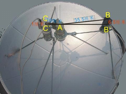 如图所示,面对正馈天线,欧卫W5在主焦右侧,距主焦约35.5厘米、偏上约6.5厘米(测量误差0.5厘米);中星6B在主焦左侧,距主焦约10厘米、偏上约1厘米。
